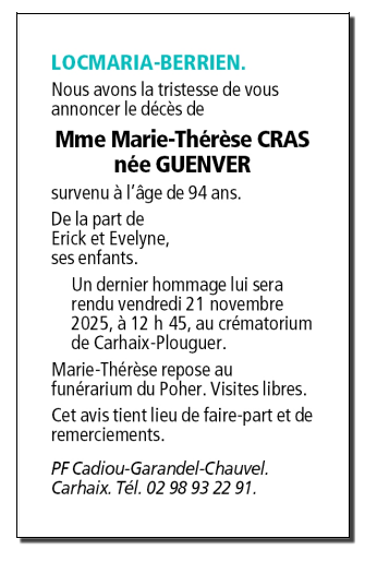 Décédée à Carhaix-Plouguer (29270, France) le mardi 18 novembre 2025 à l'âge de 94 ans
