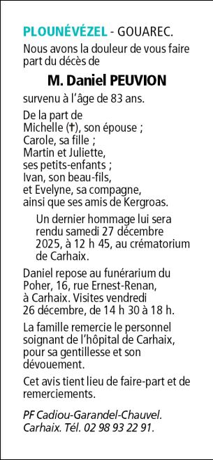 Décédé à Carhaix-Plouguer (29270, France) le lundi 22 décembre 2025 à l'âge de 83 ans