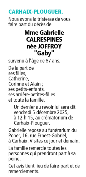Décédée à Carhaix-Plouguer (29270, France) le dimanche 30 novembre 2025 à l'âge de 87 ans