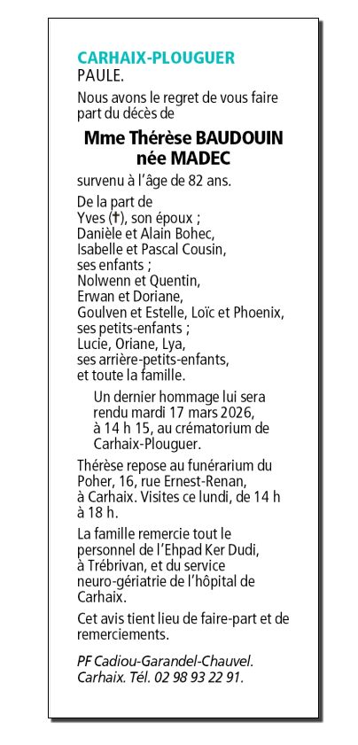 Décédée à Carhaix-Plouguer (29270, France) le samedi 14 mars 2026 à l'âge de 82 ans