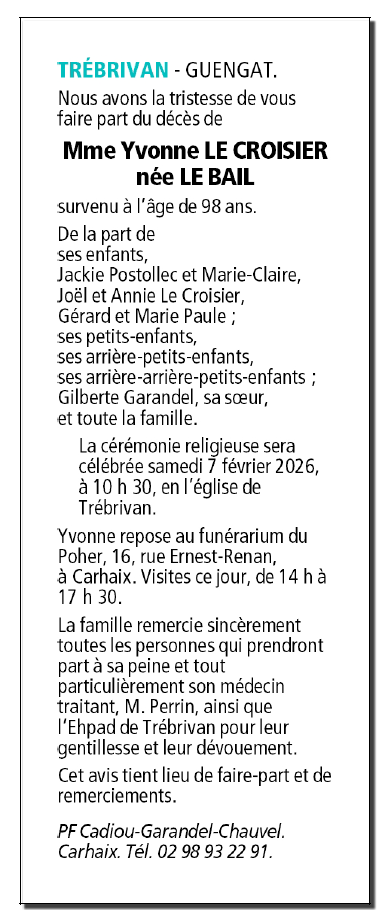 Décédée à Trébrivan (22340, France) le jeudi 5 février 2026 à l'âge de 98 ans