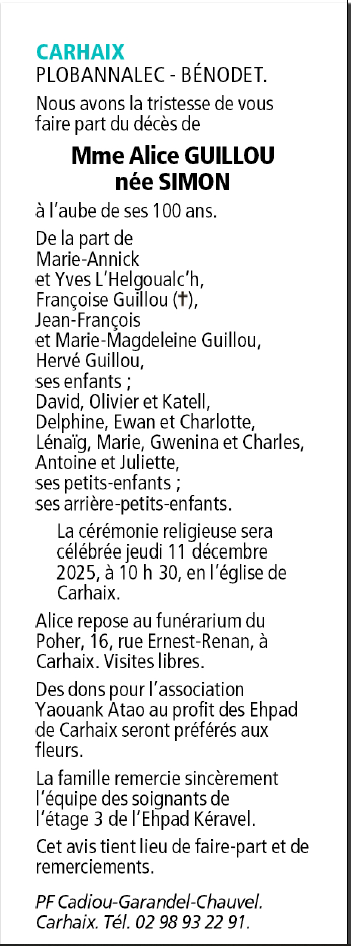 Décédée à Carhaix-Plouguer (29270, France) le dimanche 7 décembre 2025 à l'âge de 99 ans