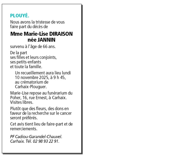 Décédée à Quimper (29000, France) le mercredi 5 novembre 2025 à l'âge de 66 ans