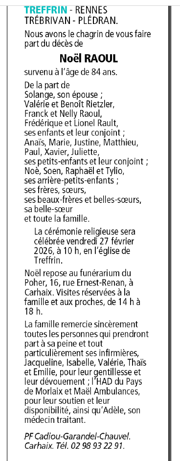 Décédé à Treffrin (22340, France) le lundi 23 février 2026 à l'âge de 84 ans