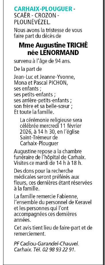 Décédée à Carhaix-Plouguer (29270, France) le lundi 9 février 2026 à l'âge de 94 ans